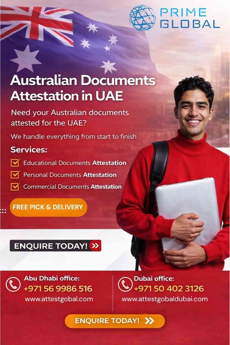 Australia document attestation services in abu dhabi is an important process that verifies the authenticity of certificates issued in Australia so they can be legally recognized by authorities in the United Arab Emirates. Attestation confirms that the documents are genuine and issued by legitimate institutions. This process is required for various purposes such as employment, higher education, family sponsorship, business setup, and other official procedures in the UAE. attestation services in abu dhabi, Dubai, Sharjah, and across the UAE ensure that Australian documents are properly verified before being submitted to government departments, employers, or educational institutions. Without proper attestation, many official authorities may not accept the documents for legal or administrative use. Common reasons for Australian document attestation include employment visa processing, university admissions, family or dependent visa sponsorship, professional licensing, company formation, and other legal documentation requirements. The attestation process generally involves several verification stages. These typically include initial verification or notarization in Australia, authentication by relevant Australian authorities, attestation by the UAE Embassy in Australia, and final verification by the Ministry of Foreign Affairs (MOFA) in the UAE. Prime Global attestation services in abu dhabi, Dubai, Sharjah and UAE provides reliable and professional services for Australia document attestation in the UAE. The company assists individuals and businesses by managing the entire attestation procedure efficiently. Their experienced team handles educational, personal, and commercial documents and ensures smooth processing without unnecessary delays. 📞 Call / WhatsApp: +971 54 264 9653 / +971 569986515 🌐 Website: http://www.attestglobal.com For more details, attestation services in abu dhabi, attestation services in dubai, attestation services in uae, & attestation services in sharjah Pictures Share this Ad | |