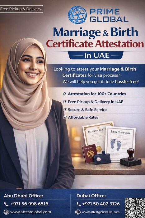 Whether it’s for visa applications, residency, or family sponsorship, proper attestation ensures your documents are recognized and legally valid. Prime Global Attestation services in abu dhabi, a leading attestation company in the UAE, specializes in providing smooth, reliable, and fast attestation services for marriage and birth certificates. With over 25,000 satisfied clients and a network covering more than 100 countries, Prime Global Attestation has become a trusted name for individuals and businesses alike. The attestation process involves several steps to verify and authenticate your documents. First, the certificate is verified by the issuing authority in your home country. Then, it goes through the Ministry of Foreign Affairs (MOFA) in the UAE for legalization. Finally, it may require embassy or consulate attestation depending on the country of origin. Prime Global Attestation services in abu dhabi guides clients through each step, ensuring accuracy and minimizing delays. Prime Global Attestation also offers free document pickup and delivery across the UAE, making the process hassle-free. Their experienced team handles all types of certificates, including marriage, birth, educational, and professional documents, with precision and professionalism. For anyone seeking secure and efficient attestation services in the UAE, Prime Global Attestation ensures peace of mind, timely delivery, and full legal compliance. Visit https://attestglobal.com or contact us on: +971 542649653 For more details, Attestation services in abu dhabi, Attestation services in dubai, Attestation services in uae, & Attestation services in uae Pictures Share this Ad | |