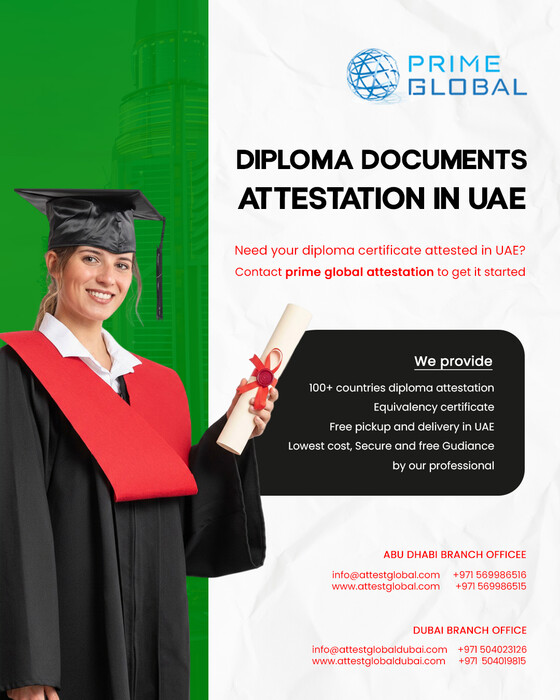 We provide diploma attestation services in abu dhabi, Dubai, sharjah and UAE for documents issued in the USA, UK, Germany, Canada, India, Pakistan, and more than 100 countries worldwide, ensuring complete compliance with UAE regulations. Our streamlined process requires minimal documentation and saves you valuable time and effort. With a strong focus on customer satisfaction, Prime Global attestation services in abu dhabi has successfully served over 10,500 clients, delivering reliable and transparent services at every stage. Our expert team manages the entire attestation procedure, from initial verification to final approval by UAE authorities. Whether your diploma is required for employment, higher education, or immigration purposes, our specialists will guide you through the process efficiently and stress-free. 📞 For any queries, call us now: 056 998 6516 / +971 542649653 🌐 Visit our website: https://www.attestglobal.com For more details, attestation services in abu dhabi, attestation services in dubai, attestation services in uae, & attestation services in sharjah Pictures Share this Ad | |