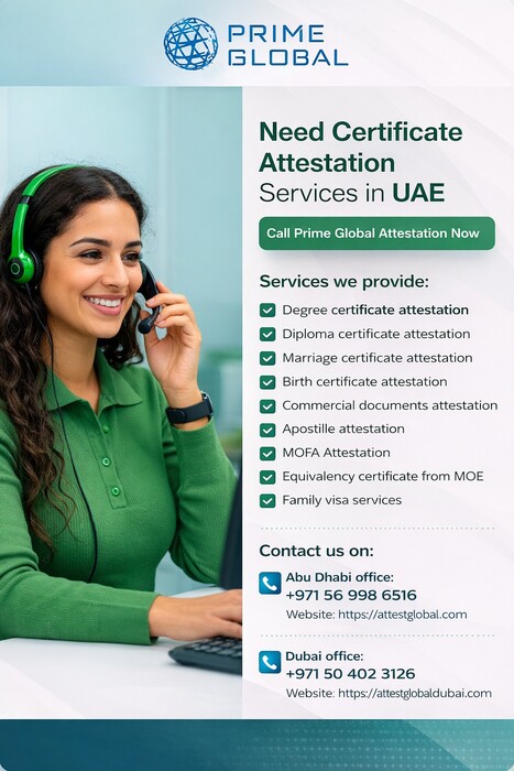 To complete these processes, it is necessary to have certificates such as degree certificates, diploma certificates, intermediate certificates, birth certificates, marriage certificates, salary certificates, experience certificates, medical certificates, and commercial documents properly attested. Prime Global Attestation services in abu dhabi, dubai, sharjah and uae is recognized as a leading attestation service provider in Dubai, Abu Dhabi, Sharjah, and across the UAE. We offer professional certificate attestation and apostille services for multiple countries including Saudi Arabia, the United States, United Kingdom, Canada, India, Australia, France, Spain, Qatar, Oman, Pakistan, Bangladesh, and more than 120+ countries worldwide. To ensure maximum convenience, we also provide free pickup and delivery services across the UAE, making the entire process simple and stress-free. Why Choose Our Services? * 24/7 Customer Support for all your queries * Online tracking system for real-time updates * Complimentary pickup and delivery anywhere in the UAE * Safe, secure, and confidential handling of documents * Expert guidance and assistance throughout the process * Fast and hassle-free attestation services * Flexible partial payment options * Express service available for urgent requirements * Document insurance for added peace of mind * Genuine, reliable, and professional service quality With Prime Global Attestation services in abu dhabi, Dubai, Sharjah and UAE, you can trust that your documents are handled with care, accuracy, and efficiency, ensuring a smooth attestation experience every time. We’re here to simplify the process for you! Get your documents attested for employment, higher education, family visa, and business needs across the UAE. 🔹 Our Services: ✔ Educational Certificate Attestation ✔ Personal Document Attestation ✔ Commercial Document Attestation ✔ Equivalency Certificate Assistance 📩 Get in touch with us today and let our experts take care of your attestation needs. 📞 Call/WhatsApp: 056 998 6516 / +971 54 264 9653 🌐 Website: www.attestglobal.com For more details, Attestation services in abu dhabi, Attestation services in dubai, Attestation services in sharjah, & Attestation services in uae Pictures Share this Ad | |
