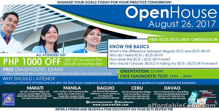 – What is the difference between Regular IELTS and IELTS UKVI? – Why do I need IELTS and IELTS UKVI? – How does IELTS and IELTS UKVI work? – Why choose JROOZ in taking my IELTS / IELTS UKVI review? All attendees get: – PHP 1,000 discount (500 off on exam fee, 500 off review fee) – Free Diagnostic Exam – A Chance to win free review – Slots and discount for IELTS exam fee Event Link: http://www.jroozreview.com/jrooz-ielts-ielts-ukvi-open-house-august-26-2017 To know more information about the JRooz IELTS review programs, Please Visit: http://jroozreview.com/ielts-review-center. For more information, please contact us through: Makati: (02)832-3093 / (02)750-6612 / 0917-895-4671 / 0917-300-9725 / 0915-957-2497 Manila: (02) 521 7675 / 0920-9519546 / 0917-8770300 Davao: (082) 282 4479 / (082) 282-1412 / 0917-894-1546 / 0917-860-6628 Cebu: (032) 266 2822 / (032) 236 6726 / 0917-865-7669 / 0917-825-7669 Baguio: (074)661-6064 / 0917-860-6630 Pictures Share this Ad | |