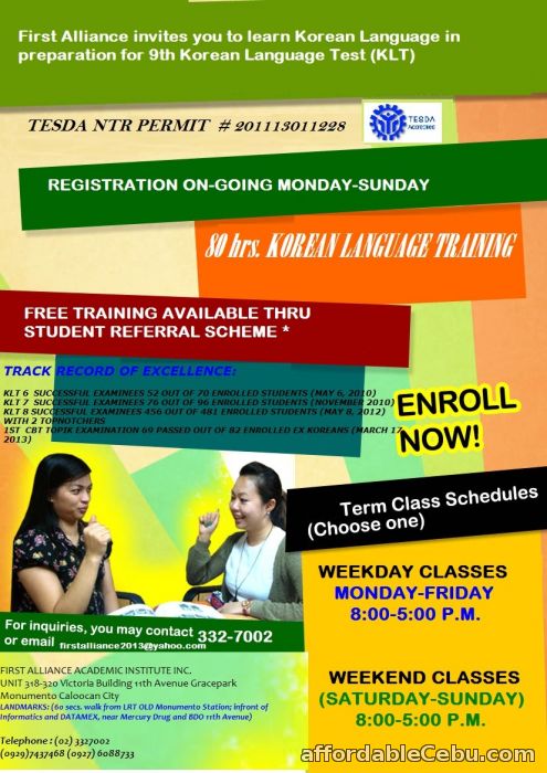 FIRST ALLIANCE ACADEMIC INSTITUTE INC. Unit 318-320 Victoria Bldg. 11th Avenue Gracepark Monumento Caloocan City (60 sec. walk from LRT Monumento Station, near Mercury Drug 11th Avenue facing BDO and Equicom Bank and Informatics.) TEL. NUMBER (02)3760922 0908-2541622/ 0915-1138373 Pictures Share this Ad | |