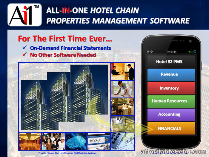 Promo Price is for Reservations Module Lite Version ONLY. Inquire for Ai1 Lite, Deluxe, Premier package pricing. Attention All Hotel Chains: In today’s digital economy, how can you risk decisions made on weeks-to- months-old information? Introducing Ai1, the world’s first all-in-one Hotel Chain Properties Management System which also covers all aspects of Revenue, Inventory, Labor, and Accounting no other software needed. Ai1 is specifically engineered to give you key intel on your Hotel properties faster than ever before, including the fastest-ever financial statements and inventory within 24 hours. 24/7 Local Filipino Support. Terms and Conditions apply. Ai1 also covers the crucial business functions common to all businesses, including: 1. Transaction and Revenue Management. 2. Materials and Asset Management Warehousing Inventory Control. Asset Management. 3. Human Resources Management Localized payroll. Human Resources Information System. Timekeeping. 4. Accounting. GAAP/IFRS Compliant Seamless integration with all other modules. No redundant entry. Now for the first time ever enjoy on-demand management reports right to your mobile phone. Anywhere in the world! Ai1. All-In-One. By Gatessoft Corp. Call now for a free, no-obligation demo. CONTACT US NOW. 02-501-5846 02-869-7766 02-833-3995 inquiry@gatessoftcorp.com www.gatessoftcorp.com 4th Floor VGP Center, 6772 Ayala Avenue, Makati City *Indicated price is not the actual price. Prices may vary depending on the transaction made and product purchased. Pictures ![]() Share this Ad | |
