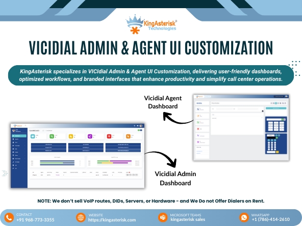 It’s time to give your agents an interface that actually makes sense and doesn't give them a headache by noon. Discover Live – Watch Our Demo! : https://demo.kingasterisk.com KingAsterisk Technology fixes that by tailoring VICIdial’s admin and agent screens to fit your specific needs, making the whole system more effective. Optimized Agent Workflow Visual Admin Dashboards Responsive Design Brand Integration Note: We don’t sell VoIP routes, DIDs, servers, or hardware — and we do not offer dialers on rent. Call us: +91 968 773 3355 WhatsApp: +1 (786) 414 2610 Email: king@kingasterisk.com Microsoft Teams: kingasterisk sales Visit our website https://kingasterisk.com or https://dialerking.com Pictures ![]() ![]() Share this Ad | |